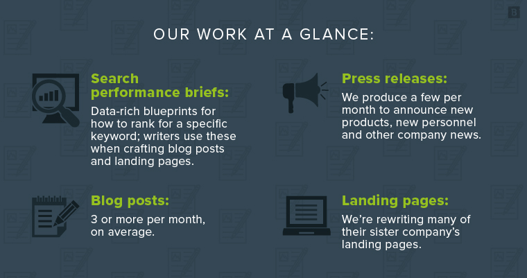 - Landing pages: We’re rewriting many of their sister company’s landing pages.