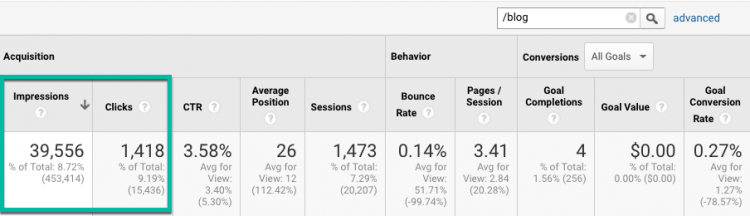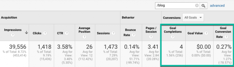 Note the blog alone is responsible for 9 percent of their entire Google search presence, and contributes 9 percent of all clicks to the site. These visitors are all tippy-top of funnel at this stage, and should not be expected to be driving macro conversions.
