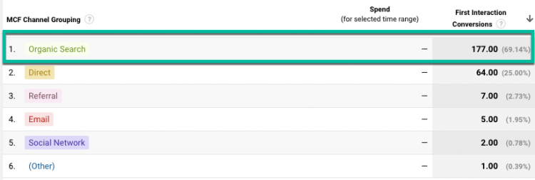 Going back to our client, we see that, using a First Interaction Model, organic search contributes 69 percent of all macro conversions (request for demo, etc.). This means if we were to give full credit to the first source a visitor came from, 69 percent of it would go to organic traffic.