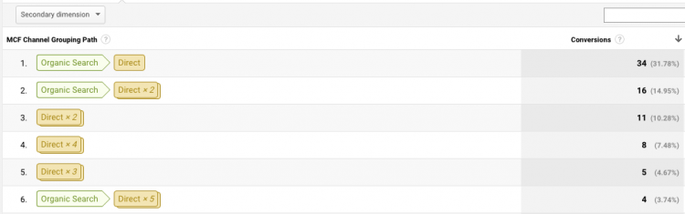 There we go. To summarize, this data shows most converting visitors first arrive via organic traffic. But generally this is not when they make their conversion. They convert at some point after their first interaction with the site. Most often, they convert after directly navigating to the site (once they are familiar with the brand). To confirm this fact, let’s take a look at the top conversion pathways: