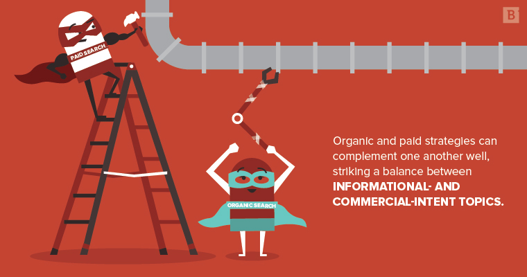 There’s no need to bash PPC, but if it’s the primary weapon at your disposal, you need to diversify. As a matter of fact, organic and paid strategies can complement one another well, striking a balance between informational- and commercial-intent keywords.