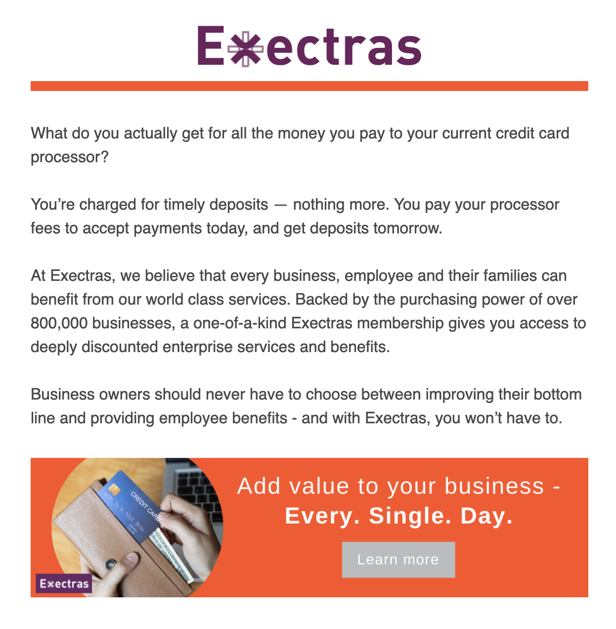 Exectras provides companies with membership-based access to heavily discounted business services ranging from insurance, to payment processing, to identity-security programs, and everything in between. You name the professional service. Exectras can likely provide it.