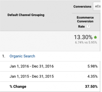 While the site did in fact bleed 21 percent of its organic traffic, those visitors who reached the site organically actually converted 37.5 percent more often than the previous year, resulting in 14 percent more revenue via this channel. They average a 6 percent conversion rate for all organic traffic.