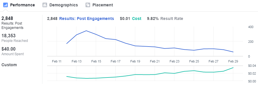 Facebook suggests using custom images or video to garner engagement, and we tend to agree based off of the work that we’ve done for this campaign and for many of our other clients. To put it simply, if you want to get the most out of your ads, you need to think long and hard about what messaging is going to strike the right chord with your audience. Analyzing your social media data is a great place to start in this endeavor, but never lose touch with your brand voice and creativity in the process.