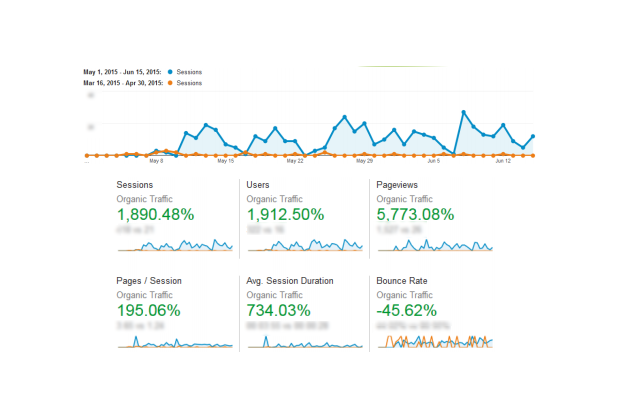 This chart shows the results we saw after launching the blog content on our client’s site. There is a noticeable lift in the amount of traffic when we began publishing original articles. At the 1.5 month mark, the number of visits had increased 1800%.