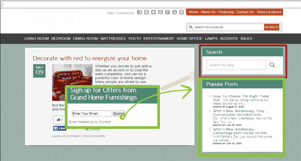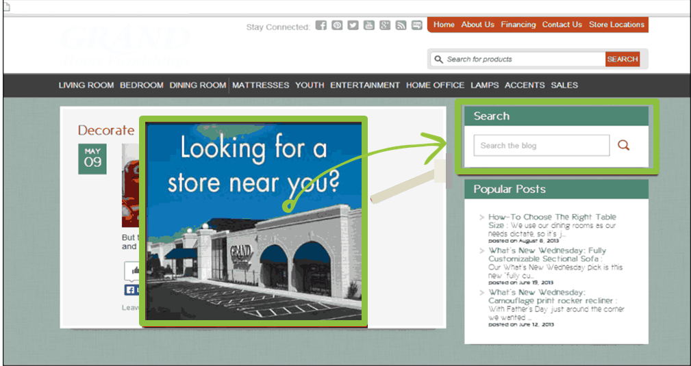 Under Brafton’s recommendation, the company replaced its on-site navigation bar with a call to action button that prompted users to find the nearest stores. It also swapped out a “popular posts” tab with a CTA where visitors could enter their emails to be added to its newsletter mailing list.