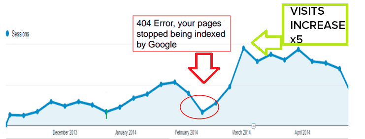 This particular business had been working with Brafton to execute a content marketing strategy, and it was seeing preliminary results. There were more visitors going to the site, and all the fresh content was rapidly being added to Google’s index … but then there was a sudden drop off – no more indexing and far fewer visits. The strategist team looked into the sudden impact and identified the issue as a 404 error, caused by a broken link somewhere on the site.