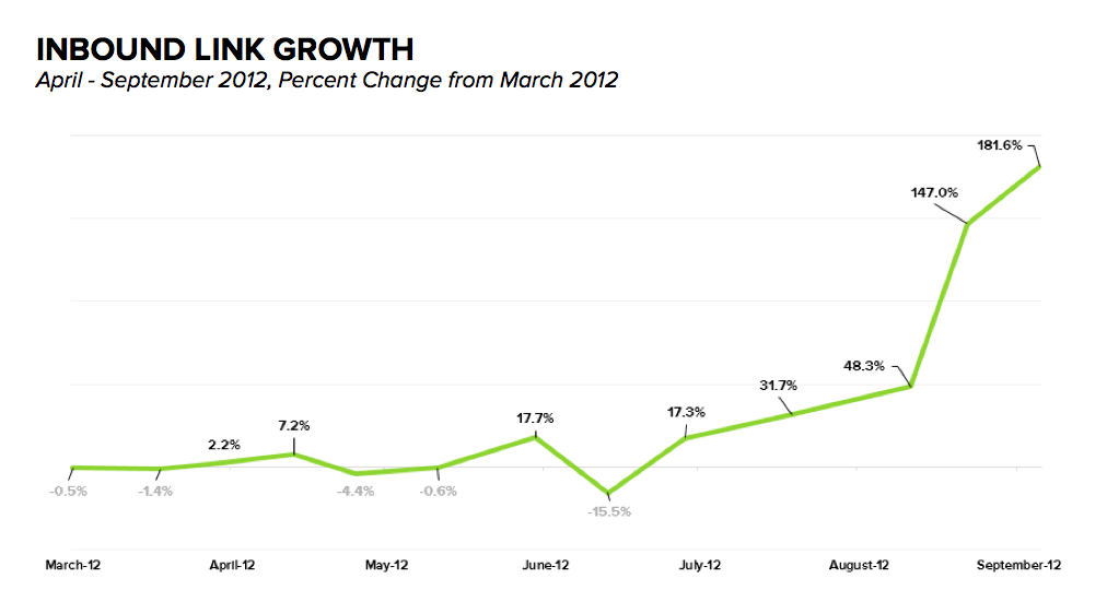 Understanding the ways people endorse brands on the web is critical to assessing thought leadership. Inbound links from quality pages or influential social users suggest content stands out to people as credible and share-worthy. Diverse content contributed to a 181 percent increase in ShoreTelSky.com’s inbound links from March 2012 through September 2012.