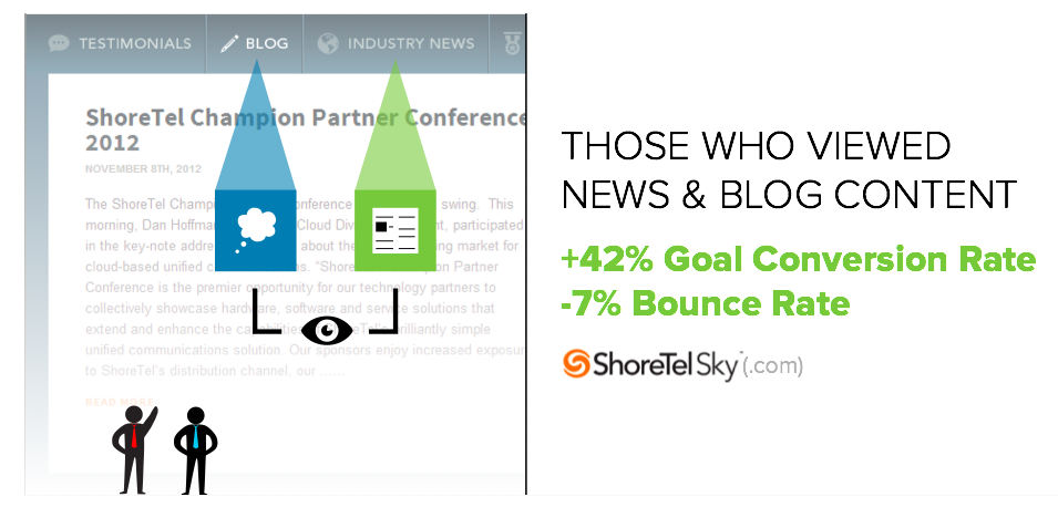The news landing page, used as a hub for all of ShoreTel Sky’s industry news content, has proven vital to attracting new traffic. It’s become a top landing page and one of the most frequently accessed paccessing other pages. In fact, average time on site is consistently higher among prospects reading news and blogs than visitors who do not.