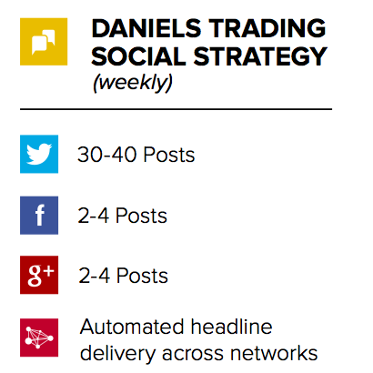 In addition to shared website headlines, Brafton gives Daniels Trading up to 150 custom Twitter updates per month, and an additional 30 updates combined between Google+ and Facebook. These updates sometimes involve shared website headlines, but none are automated: They are interactive social posts targeted at key online followers.
