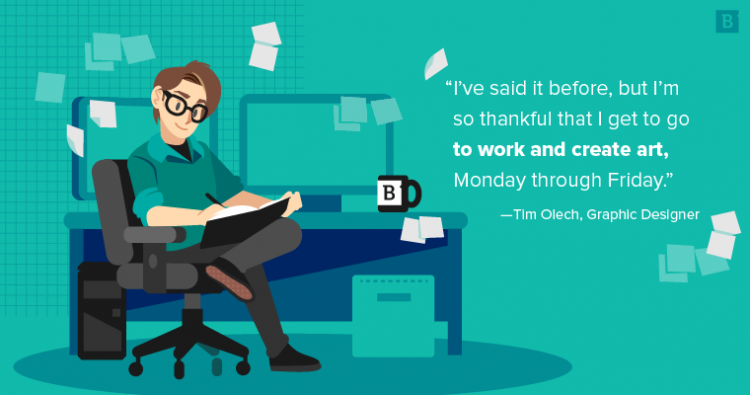 He doesn’t mean to be cliche, but Tim stressed the fact that he loves being able to create every day at work. There were instances down his professional path when he didn’t have the flexibility to be creative and put his design skills on display, but his career at Brafton flipped this, and for that, he’s grateful.