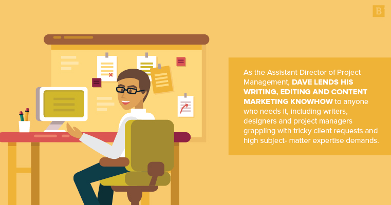 That experience has paid off handsomely – not just for Dave, but for all of Brafton. As the Assistant Director of Project Management, Dave lends his writing, editing and content marketing knowhow to anyone who needs it, including writers, designers and project managers grappling with tricky client requests and high subject-matter expertise demands.
