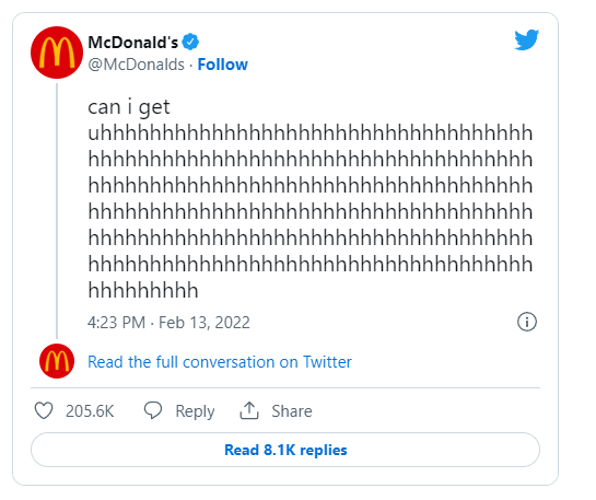 This is a particularly strong example of simple yet smart digital storytelling. Although it’s technically just text, it becomes something much funnier — and more relatable — by stretching the “uh” to fill an entire Tweet. (That’s called “visual storytelling,” kids.) Plus, it plays off of something that occurs in drive-thrus across the world every day.
