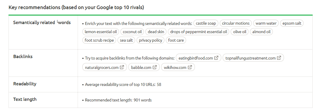 The template gives you a few suggestions, like how long your article about body scrub should be, which semantically related keywords you should use and who you should attempt to get backlinks from.