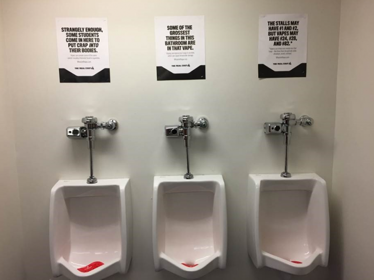 In this example, posters have been placed in a high school bathroom, using casual language and relevant information to raise awareness about “the real cost” of using tobacco products. It’s a marketing strategy where the only real profit is a safer, healthier country.