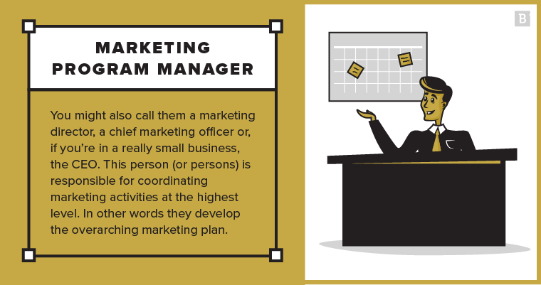You might also call them a marketing director, a chief marketing officer or, if you’re in a really small business, the CEO. This person is responsible for coordinating marketing activities at the highest level. In other words, they develop the overarching marketing plan.