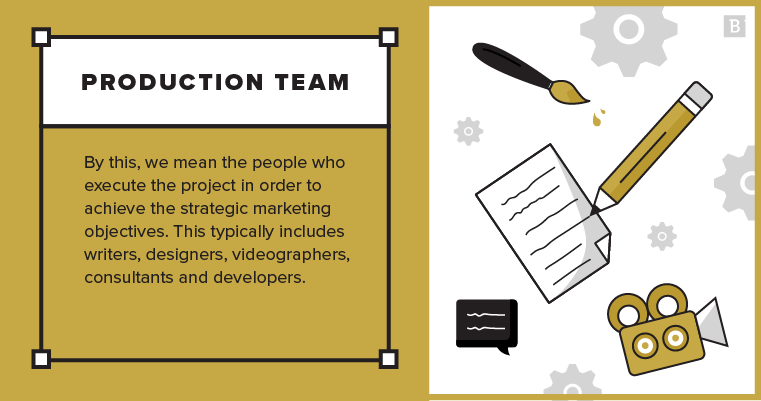 By this, we mean the people who execute the project in order to achieve the strategic marketing objectives. This typically includes writers, designers, videographers, consultants and developers.