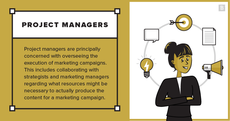 Project managers are principally concerned with overseeing the execution of marketing campaigns. This includes collaborating with strategists and marketing managers regarding what resources might be necessary to actually produce the content for a marketing campaign.