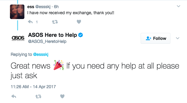 This way, customers get a faster response, and ASOS can showcase its laid-back and casual image through the tone of its social media messages:
