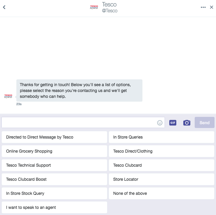 Supermarket chain Tesco takes this to the next level in their consumer social media interactions. When users send a direct message through the company’s Twitter, the company’s response includes different options for them to choose from:
