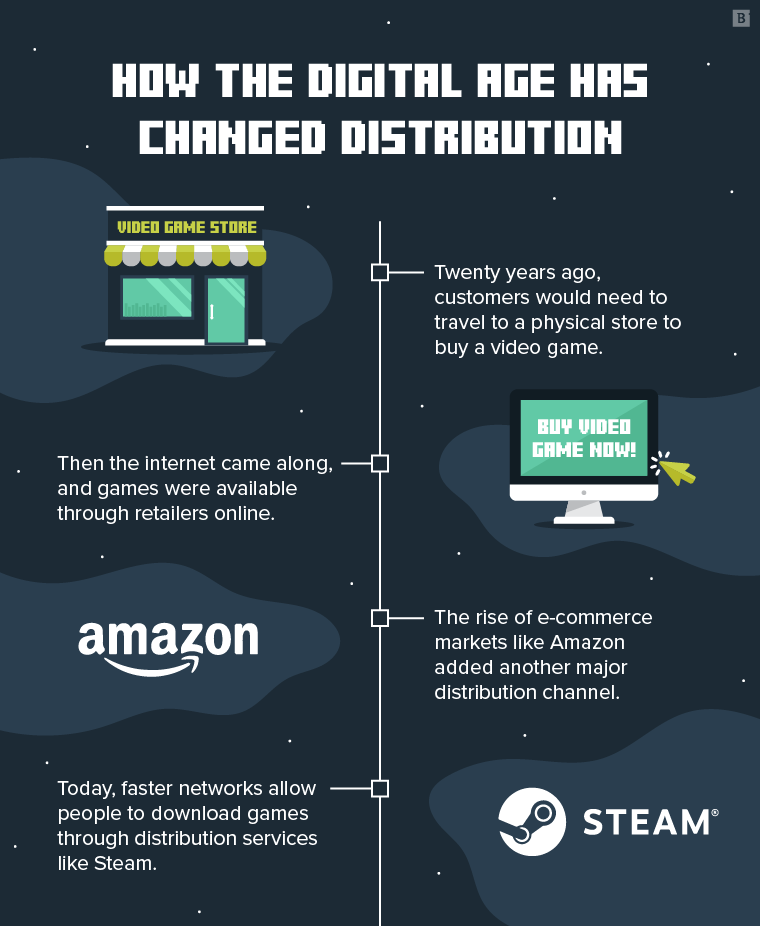 With faster networks, gamers can cut out the middleman – and physical media entirely – by downloading video games through distribution services like Steam. Brick-and-mortar stores, e-commerce retailers and online shops still remain viable distribution channels, and video game companies need to factor in all of them to reach the widest audience.
