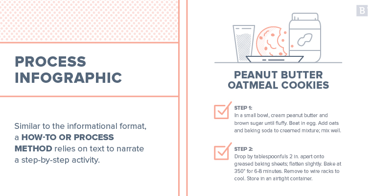 The process infographic is similar to the informational format. This kind of infographic details a how-to or process method that relies on text to narrate a step-by-step activity.