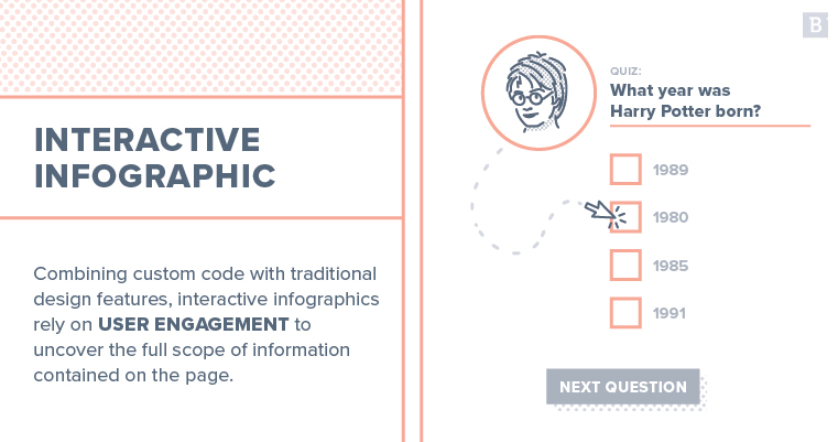 Interactive infographics are a newer addition to the marketing ecosystem. Combining custom code with traditional design features, interactive infographics rely on user engagement to uncover the full scope of information contained on the page.