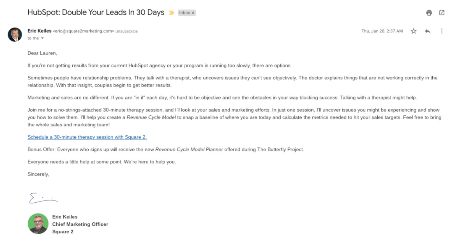 Here is a sales email from Square 2. The email’s headline tells you exactly what they’re selling and the opening line connects with the customer’s HubSpot pain points. Square 2 offers a 1:1 session with the CMO plus a bonus for signing up.
