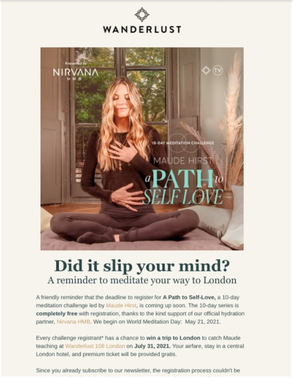 This email from Wanderlust is promoting the company’s meditation webinar. The subject line for this email is “Don’t hesitate, meditate!” It’s an attention-grabbing subject line that is sure to stand out in the sea of emails for anyone’s inbox.