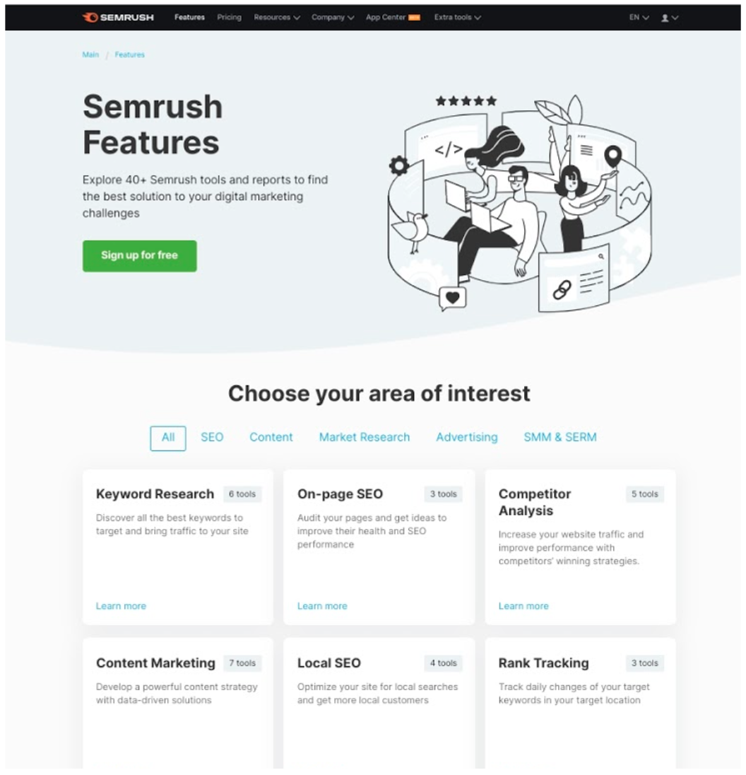 This page from SEMrush includes SEO copywriting that is selling the company’s products and services while using keyphrases to optimize the page for a top SERP spot.