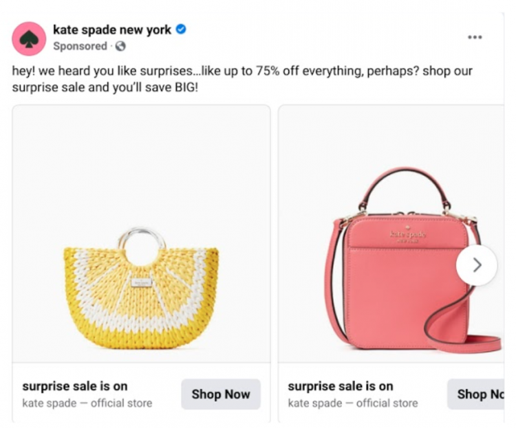 Kate Spade’s ad demonstrates marketing copywriting by its copy written at the top of this Facebook ad. They opted for lower-case type for an on-brand writing style and immediately offered the discount to prompt their prospect to click on the ad. This advertisement is clearly created with the intent of selling their purses in this example.