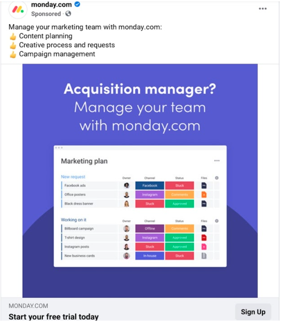 For Monday’s Facebook ad, the copy surrounding the brand’s picture directs the reader on several levels. First, the caption explains who the company is and what it’s selling. Next, it includes a CTA and website link. Monday also added a caption along the top of the ad that creatively describes its products.