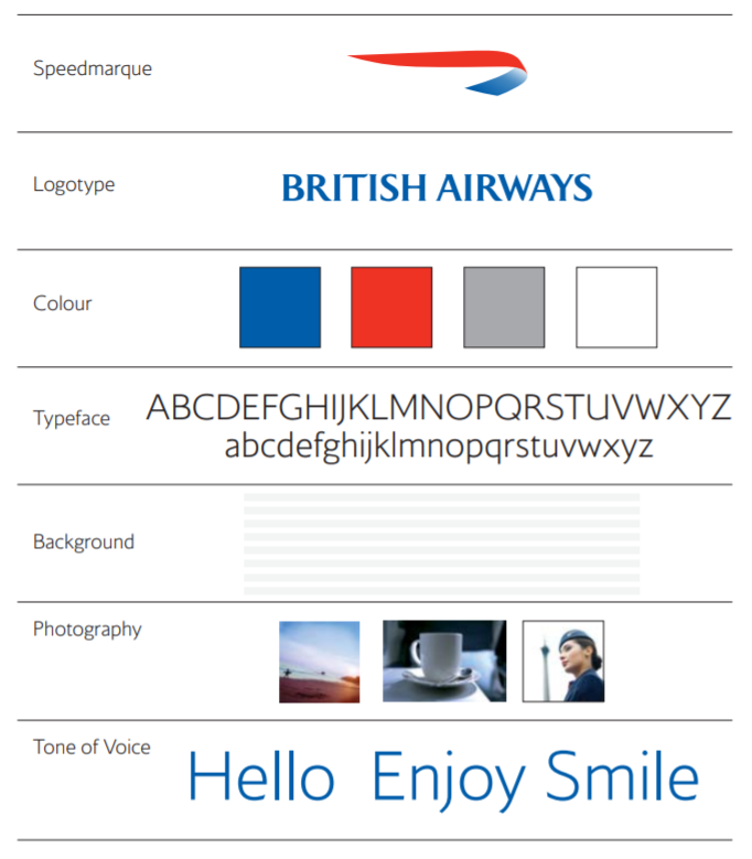 The brand style guide is the all-important deliverable your visual branding project will conclude with. Here’s an example from the British Airways brand guidelines.