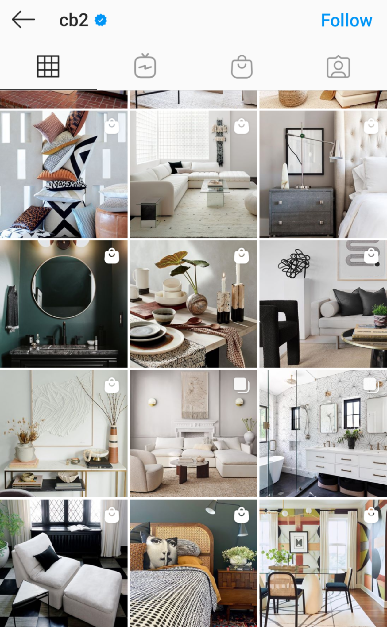 The creative direction you choose for your images can also be influenced by your brand color palette. The cb2 brand centers on dramatic, high-contrast hues and geometric shapes. Accordingly, the retailer uses imagery that exhibits these colors and qualities in their catalogs and Instagram posts.