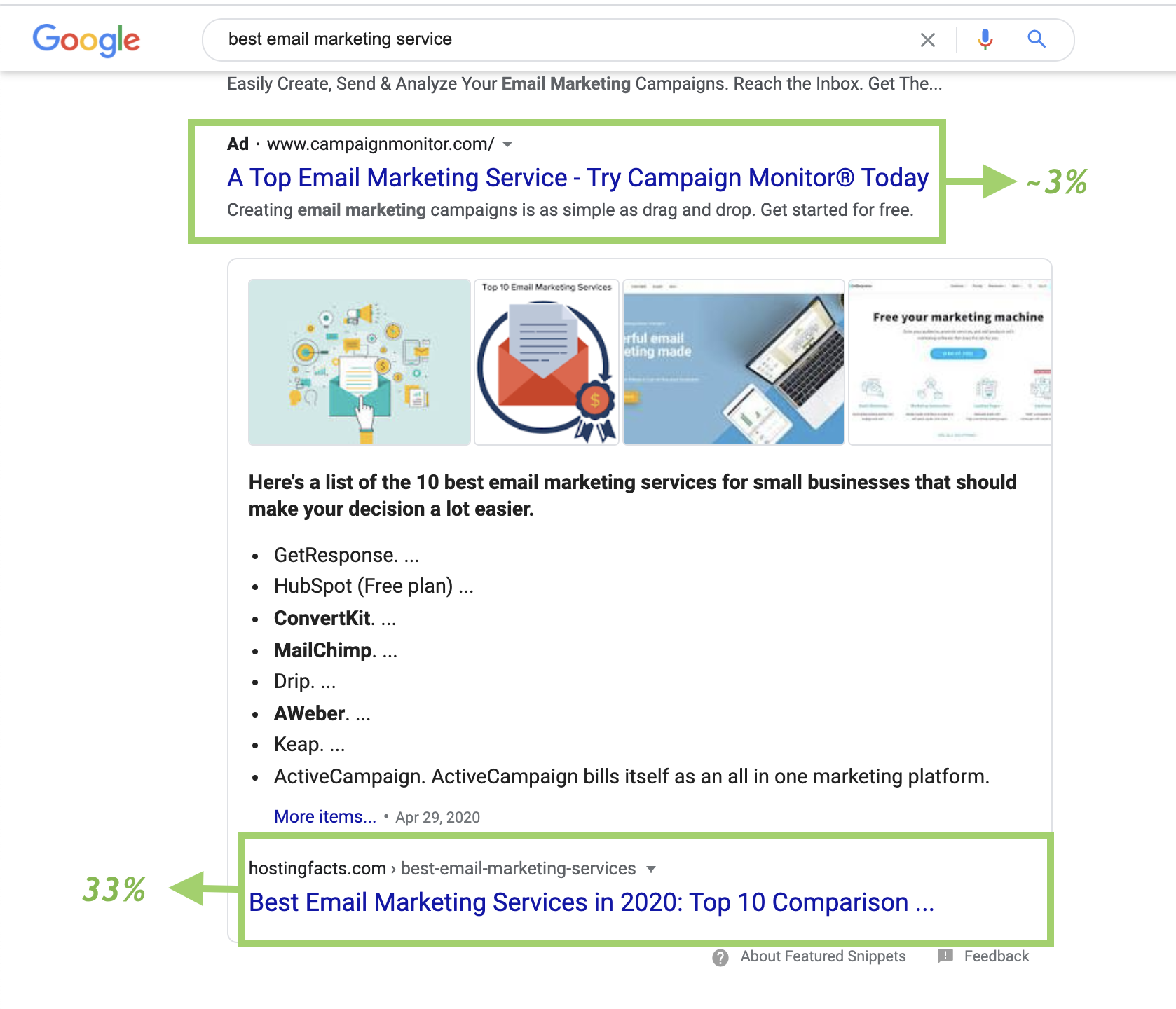 By comparison, the first organic search result will get clicked about 33% of the time. That gradually decreases as you go down the page: