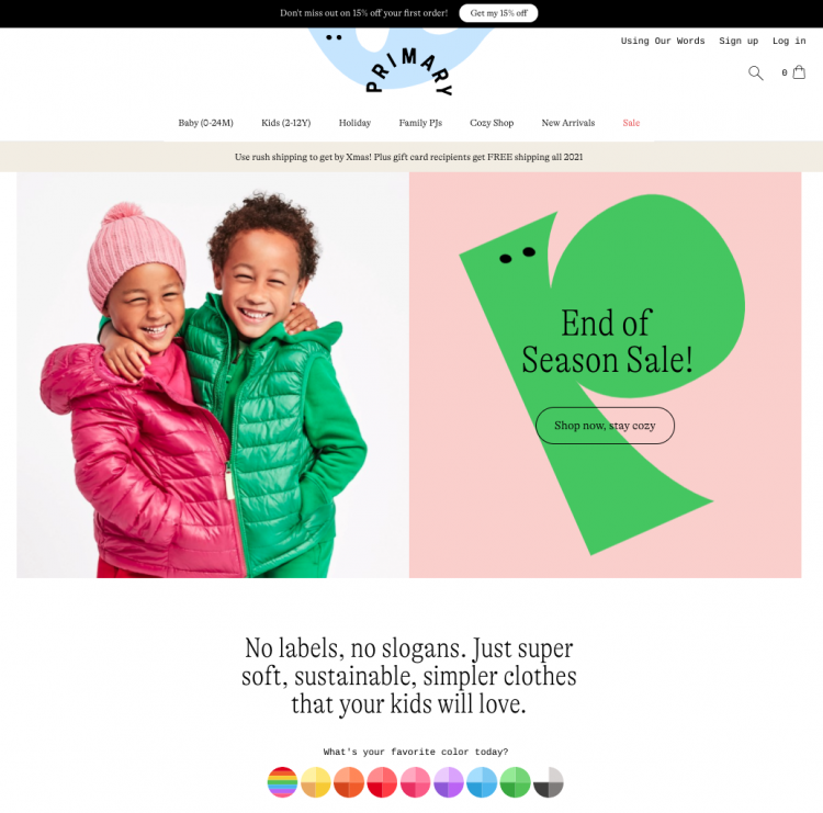 Let’s take a look at children’s clothing brand Primary as an example of what brand attributes look like in action — and how they can build a loyal customer base.