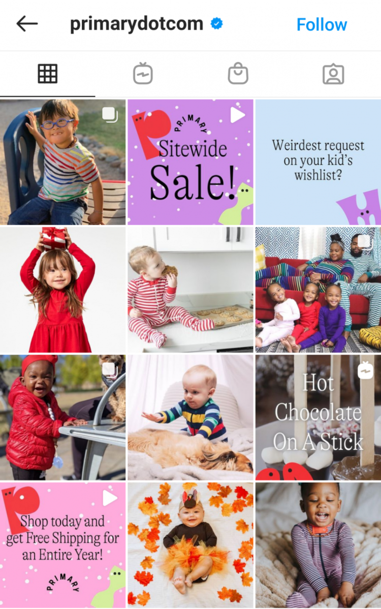 Moreover, the company demonstrates inclusivity and representation through the content they create. Finally, Primary uses a vibrant, fun-loving brand voice and color palette that echoes its slogan, “Live your true colors.”