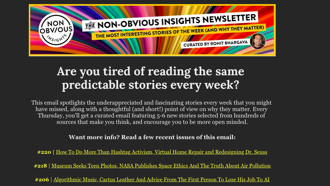 Rohit Bhargava trawls through hundreds upon hundreds of articles, guest blogs, press releases, critical-thinking pieces and other sources to deliver the best of the best to his loyal email newsletter subscribers.