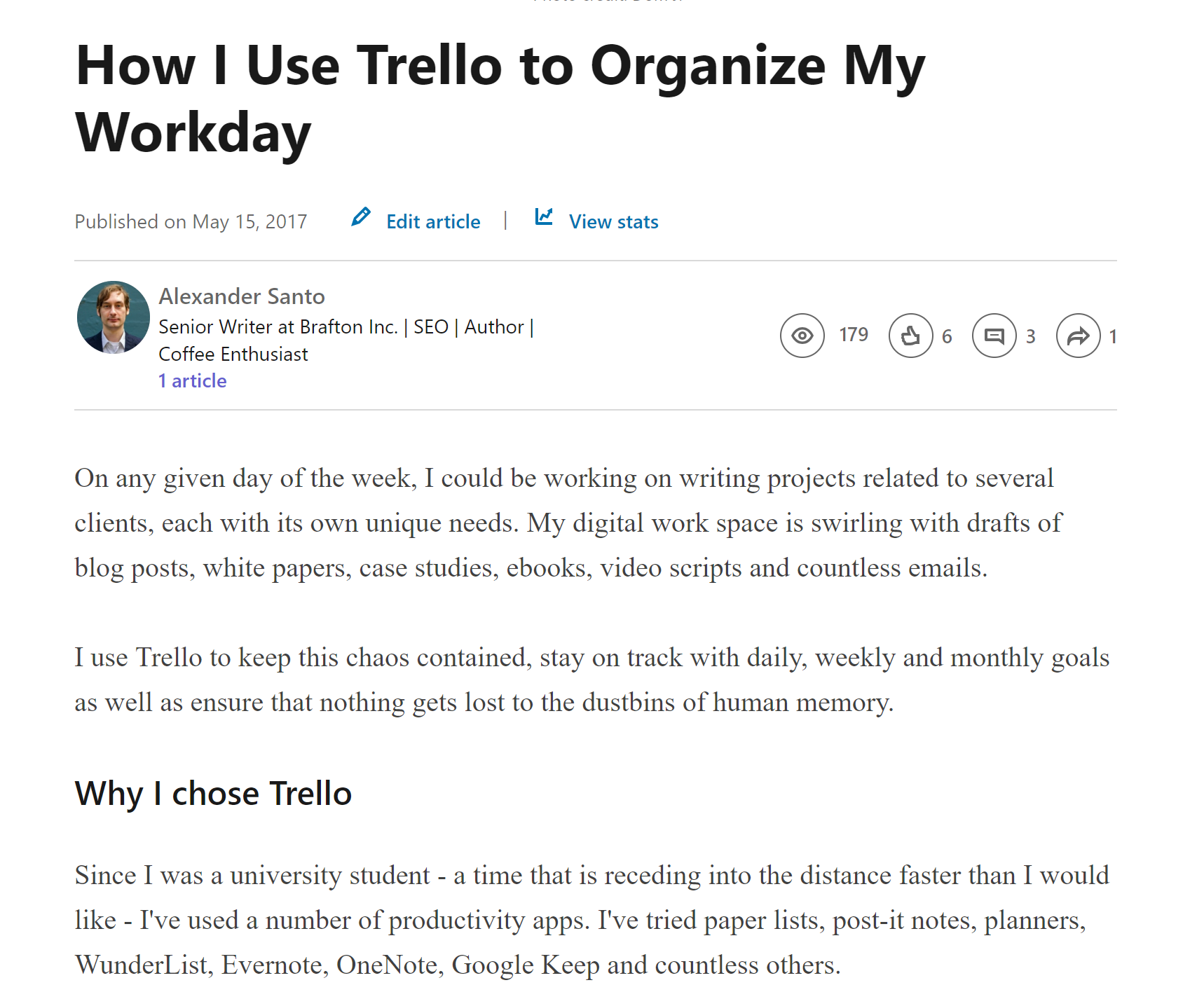 Not only can you share your expertise with people already within your network, but also with people in your secondary professional network. For example, if you share a blog post with your network and five people click the “like” button, it will be distributed to their followers as well. The more people who like and share your content, the more probable it is to gain impressions.