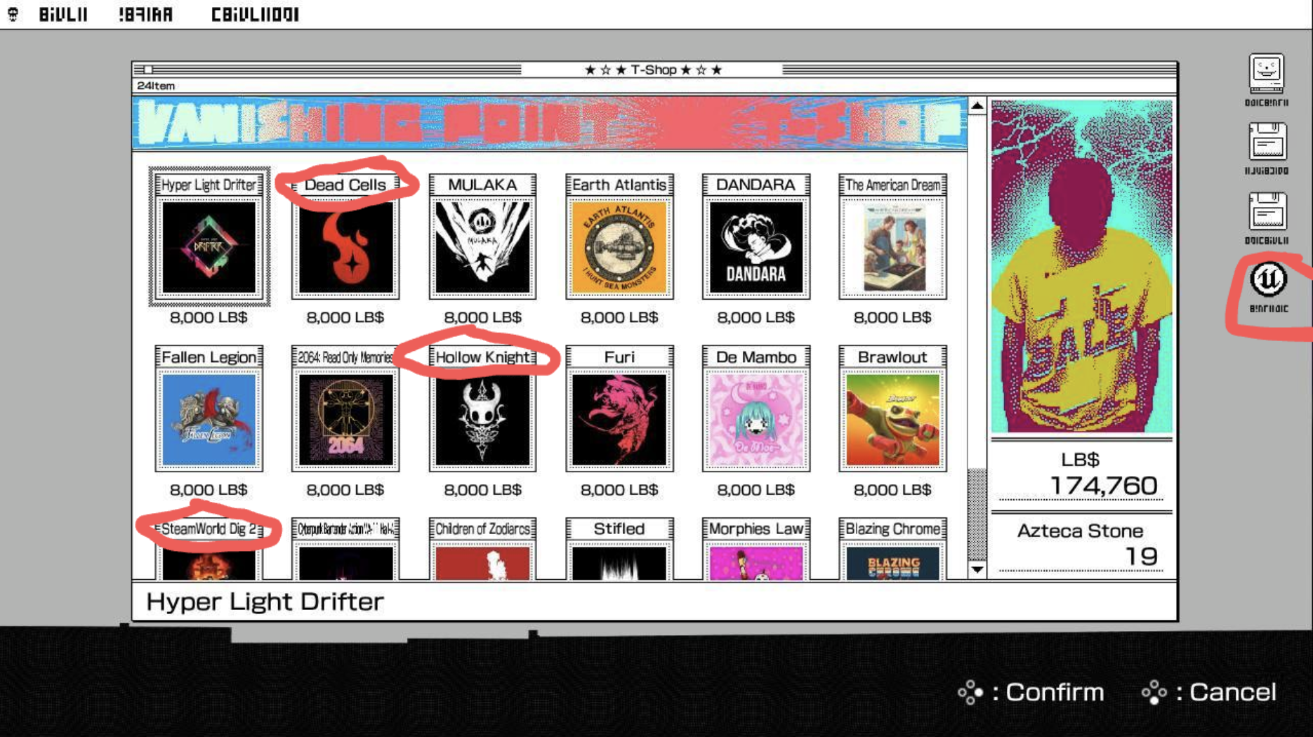 Consider this screenshot from the 2019 PC and console game, “No More Heroes: Travis Strikes Again.” In it, the character can customize his outfit with logoed t-shirts, most of which are from other independent game properties. Meanwhile, the proprietary Unreal Engine is advertised as a desktop shortcut (annotations added to indicate examples).